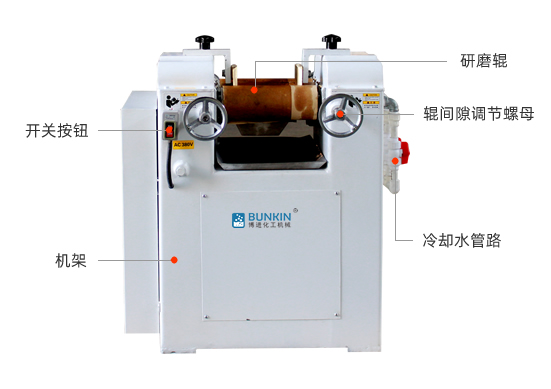 三輥研磨機由三個輥筒組成,裝在一個機架上,由電動機直接帶動。一般輥筒間的轉(zhuǎn)動方向不同,前輥向前轉(zhuǎn)動,中輥向后轉(zhuǎn)動。輥子轉(zhuǎn)速前輥快、后輥慢。中間輥固定,前后兩輥裝在滑道上,有彈簧裝置,用手輪調(diào)節(jié)前后輥與中輥的距離。物料由后輥與中輥之間進入,受到輥筒的擠壓,產(chǎn)品顆粒變細,然后由快輥帶出,快輥末端裝有刮刀,使物料與輥筒分離,落入收集桶內(nèi)。