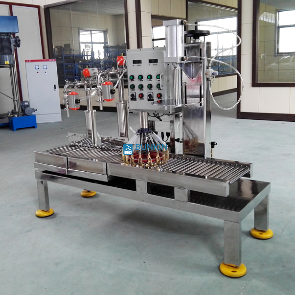 雙頭半自動灌裝機(jī)采用重量法計量,通過稱重傳感器輸出信號控制進(jìn)料閥的開度以實現(xiàn)自動灌裝的目的。進(jìn)料口前端配有進(jìn)料泵或者原料儲罐加壓的方式將物料從罐體送至灌裝機(jī),在灌裝前可以增加過濾裝置去除雜質(zhì),保證產(chǎn)品質(zhì)量;該設(shè)備具有灌裝效率高、灌裝誤差小的優(yōu)點,在涂料、油墨、油漆、瀝青、膠水、潤滑油、石油化工、精細(xì)化工等行業(yè)有廣泛的應(yīng)用,不僅適合流體的灌裝,同樣適合膏體產(chǎn)品的灌裝。