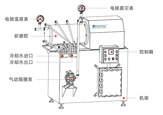 研磨腔外帶特制冷卻水夾套,在設(shè)備運行時通水冷卻,起到很好的冷卻效果,常規(guī)溫升小于10º,設(shè)備帶有溫度和壓力監(jiān)控,能夠設(shè)定“保護值”,確保產(chǎn)品品質(zhì)。