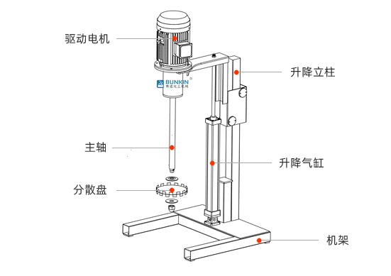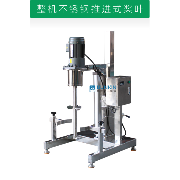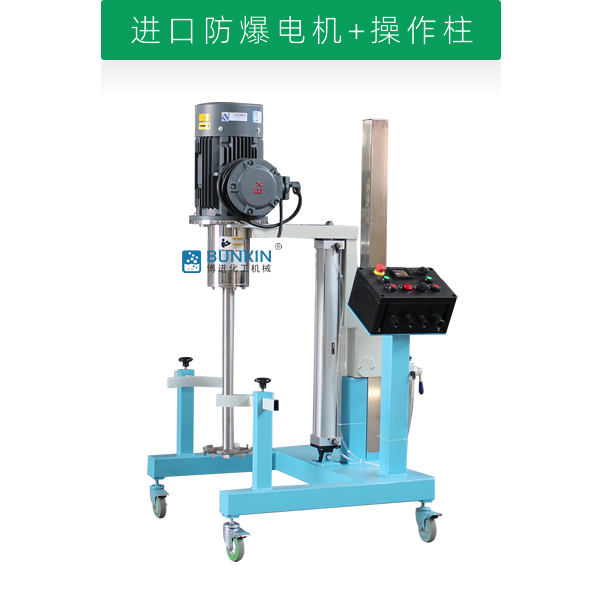 設(shè)備通過氣缸作為升降執(zhí)行器,帶氣動控制閥控制分散機上升、停止、下降,耗氣量低,操作簡單;分散盤采用內(nèi)六角螺栓與主軸固定,能夠方便快速拆卸更換,清洗容易;帶有手動夾桶裝置,可以快速將攪拌桶固定,防止桶在工作中發(fā)生位移造成安全事故;